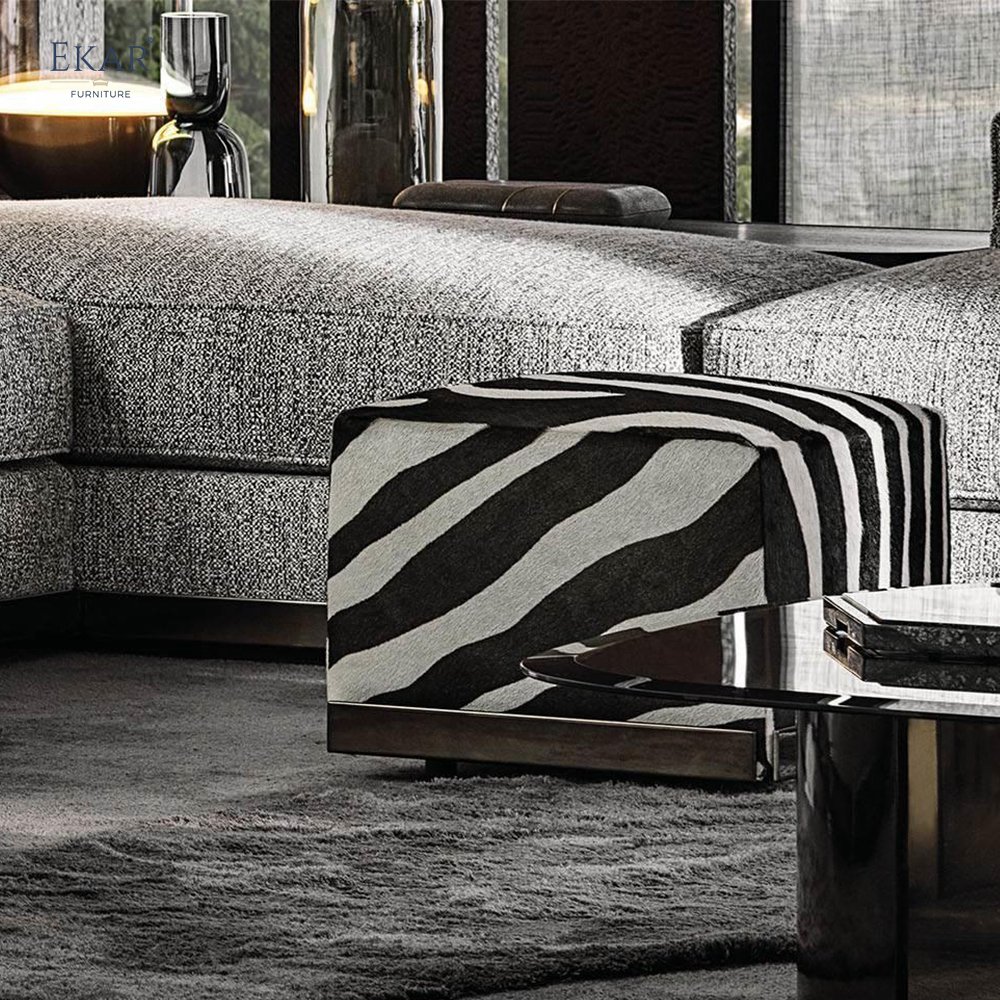 SLAB's upholstery range is designed to cover the full spectrum from quietly complementary to boldly decorative. In charcoal velvet or warm grey chenille — the most widely specified options alongside a large sofa in a contemporary living room — SLAB disappears into the seating arrangement as a well-made supporting piece that completes the room without competing with it. In dark plum velvet with a brushed gunmetal base, it provides a colour accent that enriches a monochrome or dark-toned interior. In graphic or animal-print fabric — as shown in the third product image with a black-and-white stripe pattern — SLAB becomes a deliberate decorative statement: the ottoman as art object, positioned in front of a large sofa where its pattern reads clearly as an intentional design choice. EKAR's Foshan export furniture factory supports all three directions at the same production quality standard, with custom pattern upholstery available for OEM orders. Buyers sourcing India import furniture, or retailers in the Gulf and Southeast Asia building a complete living room collection, can specify any combination of SLAB size, upholstery, and base finish through EKAR's OEM programme with Pantone colour reference or fabric sample submission.