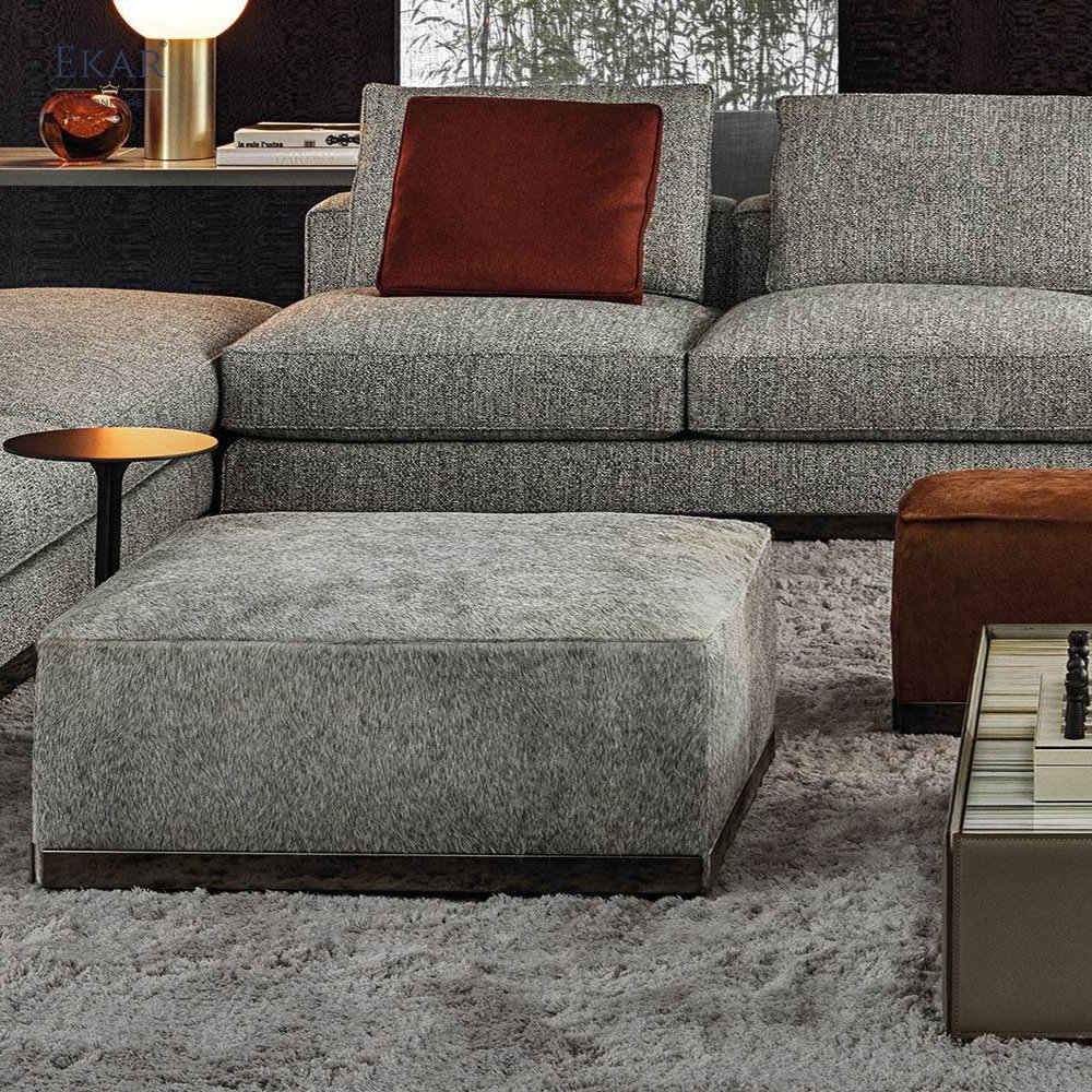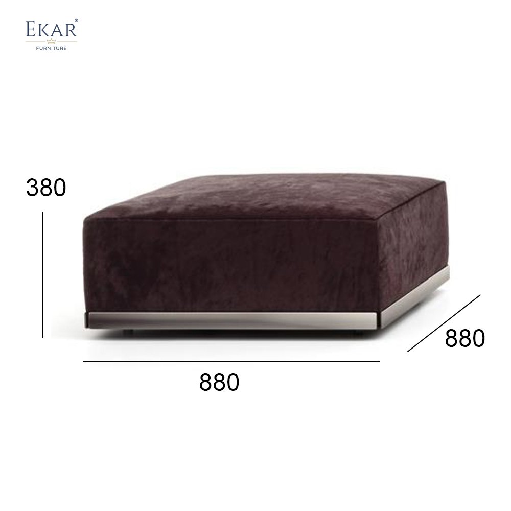 The SLAB Upholstered Ottoman from EKAR FURNITURE is designed around a straightforward principle: a single, well-made piece of soft seating should be able to serve every function a living room asks of an ottoman — footrest, additional seating surface, central coffee table substitute, and decorative accent — without compromise on any of them. The large square upholstered block, with its gently softened top corners and firm high-density foam core, provides a surface that is wide enough for two people to rest their feet simultaneously, padded enough to serve as occasional seating for a guest, and flat and stable enough to carry a tray, a book stack, or a decorative object. The low-profile brushed metal plinth base lifts the ottoman off the floor by the precise amount needed to give it visual presence without making it tall — it reads as a deliberate piece of living room furniture rather than a spare cushion on the floor. As a product from EKAR FURNITURE's mid-to-high-end Foshan furniture factory, SLAB is manufactured and exported as a companion piece to EKAR's full living room sofa collection, and as a standalone product for buyers who need a premium upholstered ottoman from a reliable China furniture factory at factory-direct pricing.