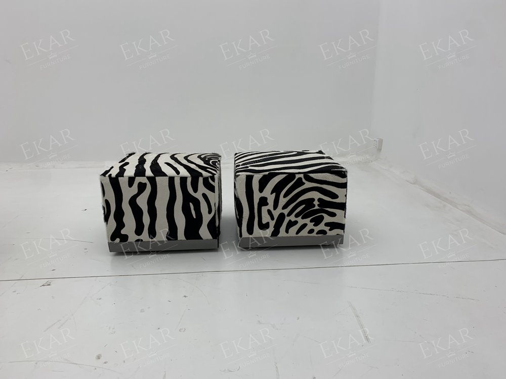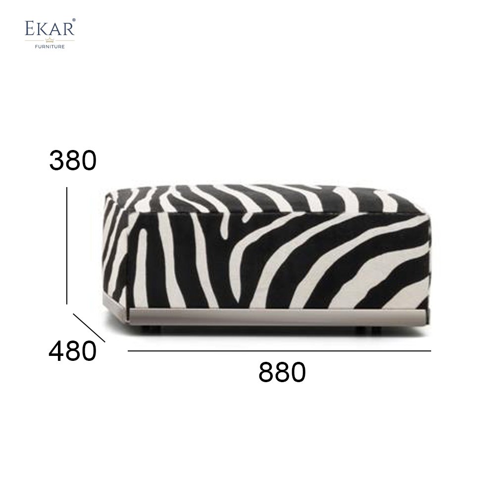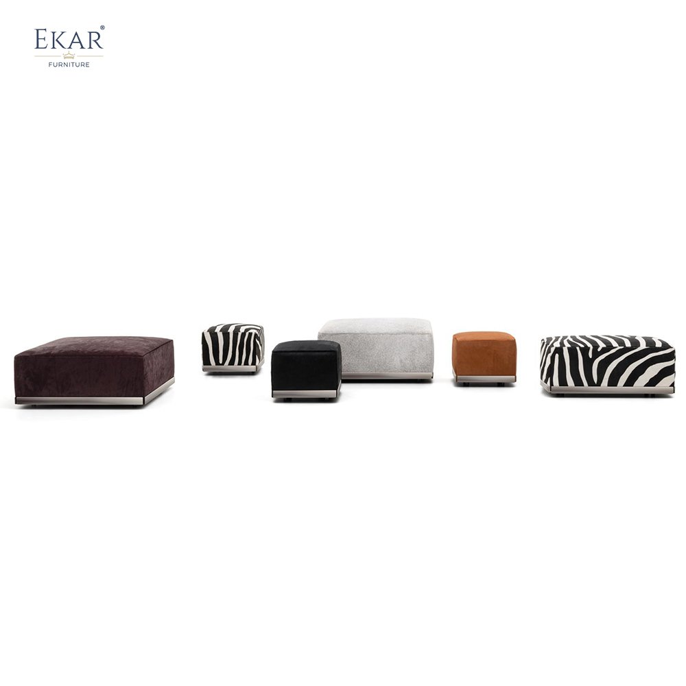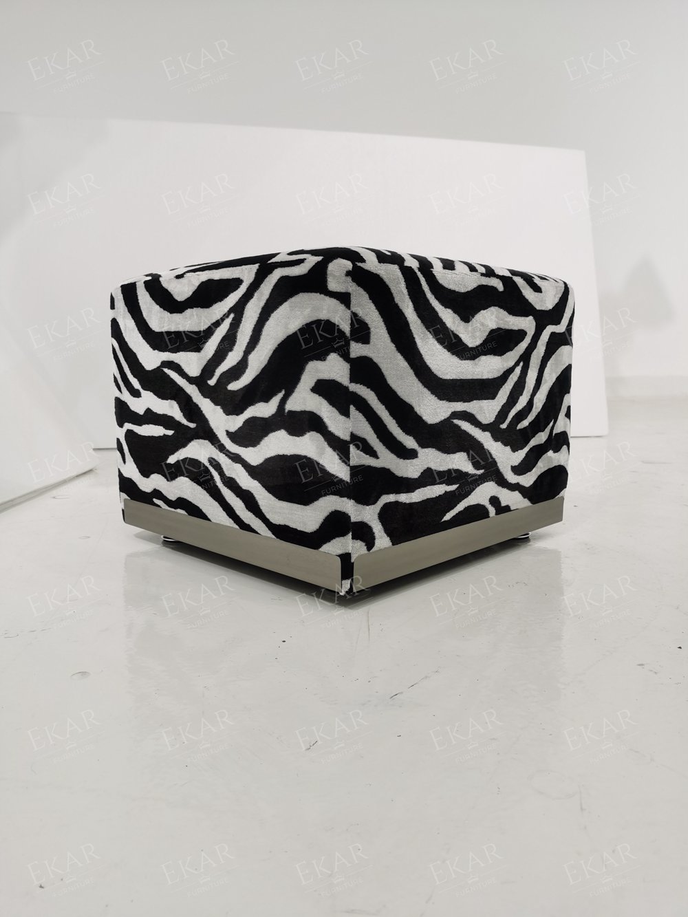 A: Yes. Graphic pattern and animal-print upholstery — including black-and-white stripe and zebra print — are available through EKAR's OEM programme. Custom pattern fabric can also be submitted by the buyer for production. This option is popular for hotel lobby accent pieces, boutique interior design projects, and living rooms where the ottoman is intended as a decorative focal point.