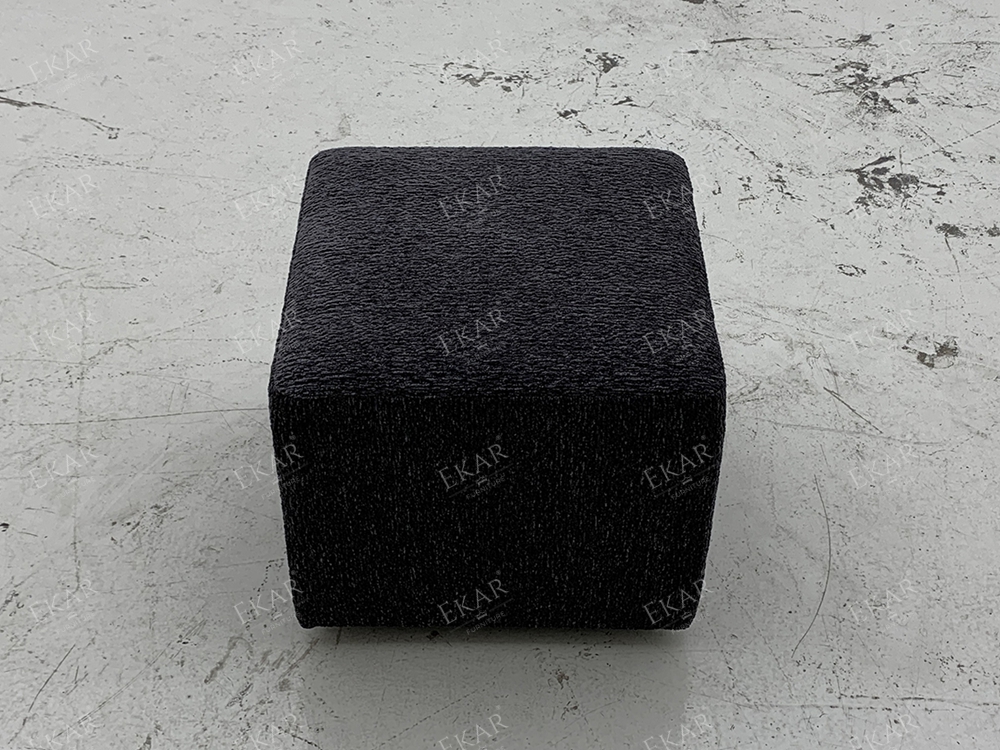 The SLAB ottoman is constructed on a solid wood internal platform frame with a welded steel perimeter that supports the metal plinth base attachment. The high-density foam used for the top and side padding is a shape-holding formulation — firmer than sofa seat foam — that maintains the flat top surface and clean block profile under sustained load without the top surface bowing or the corners losing their softly radiused definition. The upholstery is applied in a single full-wrap panel on the top and four side faces, with the seam lines positioned at the base edge where they are concealed by the metal plinth. This wrap construction is what allows the SLAB to present a continuous fabric surface across the top and all four sides without any visible seam interrupting the block form — a production standard that EKAR FURNITURE's Foshan custom furniture factory maintains across production runs for all upholstery types, from plain velvet to graphic-pattern fabric.